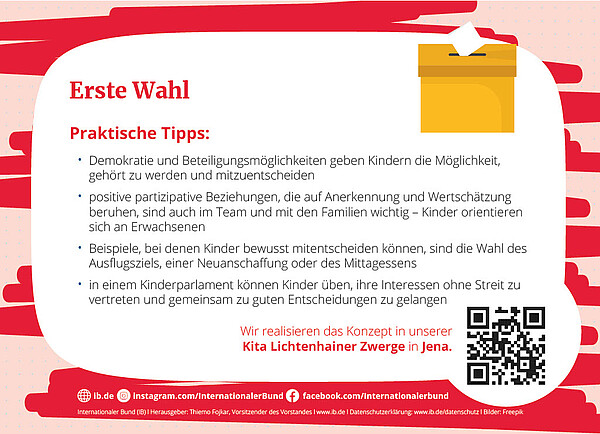 Mit unserem Demokratieprojekt vom letzten Jahr "Kita übt WAHLEN" wurden wir vom Bundeswettbewerb "Demokraktisch handeln" mit dem Kitapreis 2024 ausgezeichnet. Eingereicht wurden insgesamt 411 Projekte. Eine unabhängige Jury hat uns als eines von 50 "besonders beispielgebenden Projekten" ausgewählt.