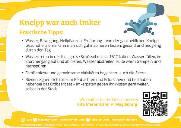 Die Kinder der Kita Marienkäfer wissen es zu schätzen, dass sie ein Wasserstampfbecken nutzen können. Wann immer sie Lust haben, können sie mit nackten Füßen durch das Becken staksen und das Prickeln auf der Haut spüren. Unser pädagogisches Konzept basiert auf der Kneipp-Philosophie, die Naturerfahrungen, eine gesunde Lebensweise und ganzheitliches Wohlbefinden in den Mittelpunkt stellt. Wir haben sogar eine Sauna! Die Kinder (3–7 Jahre alt) dürfen sie montags, dienstags und mittwochs ganzjährig nutzen. Ein besonderes Highlight ist unser eigenes Bienenvolk, das den Kindern die Natur mitten in der Stadt noch erlebbarer macht. Familie und Kiez haben in unserer Kita einen besonderen Stellenwert. Von der Feuerwehr bis zur Polizei – alle sind Teil unserer Kita-Gemeinschaft, bei uns regelmäßig zu Gast und wir dürfen entdecken, was sie alles machen.